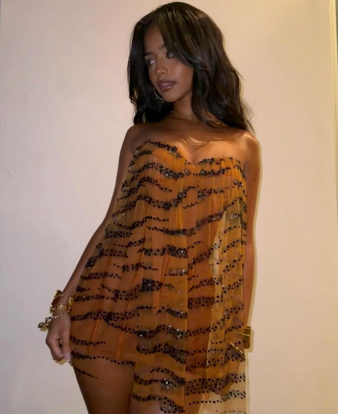 This dress isn’t just beautiful—it’s uniquely crafted to photograph flawlessly. While competitors blend into the background, the sequined tiger stripes catch every flash, spotlight, and camera angle, giving you a social-media-ready look instantly. The warm, golden undertones complement every skin tone, making your natural glow pop effortlessly. It’s the kind of piece influencers love because it feels as good as it looks, giving you that scroll-stopping aesthetic that makes people ask, “Where did you get that?”